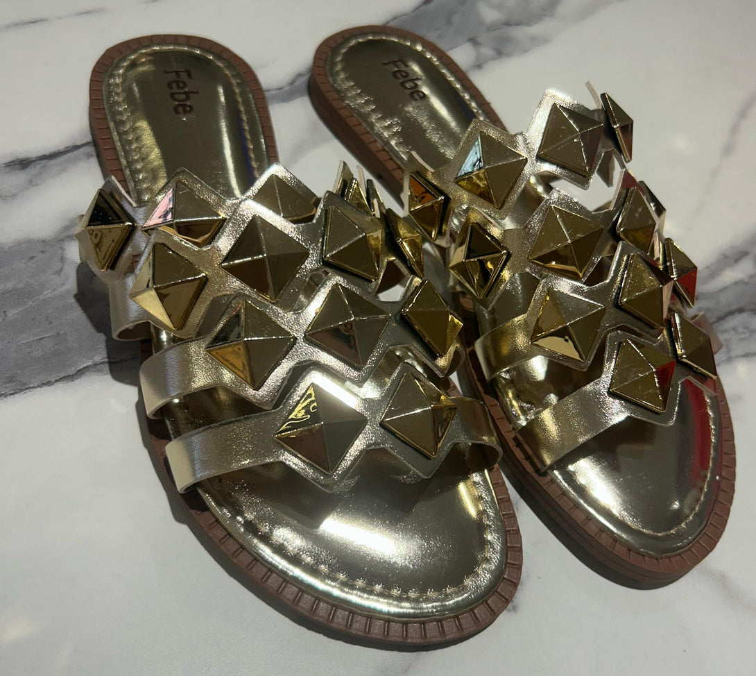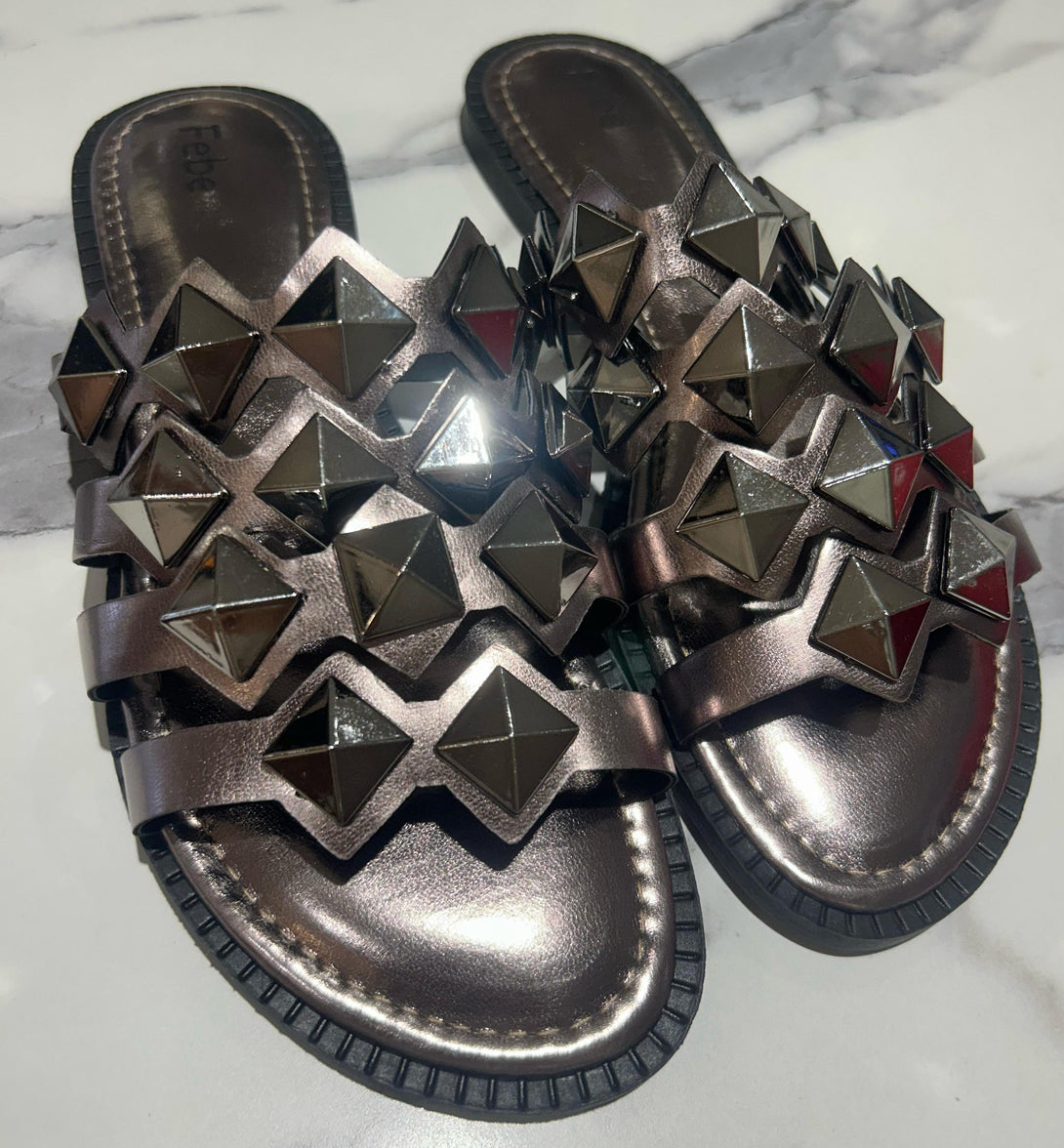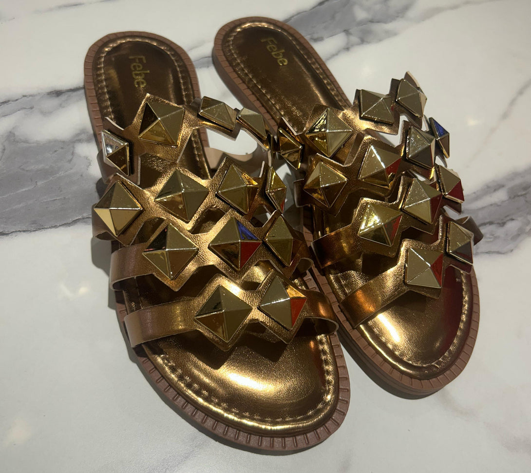 Rasteira em tiras com spikes grandes, disponível em 03 núcleos (bronze, grafite, ouro).