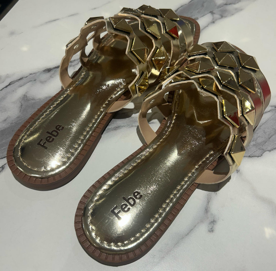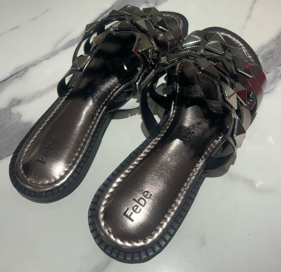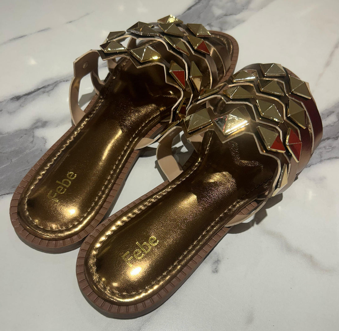 Rasteira em tiras com spikes grandes, disponível em 03 núcleos (bronze, grafite, ouro).