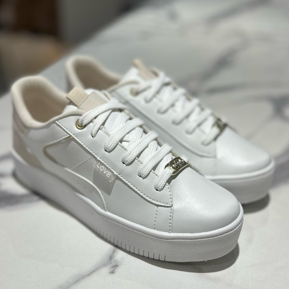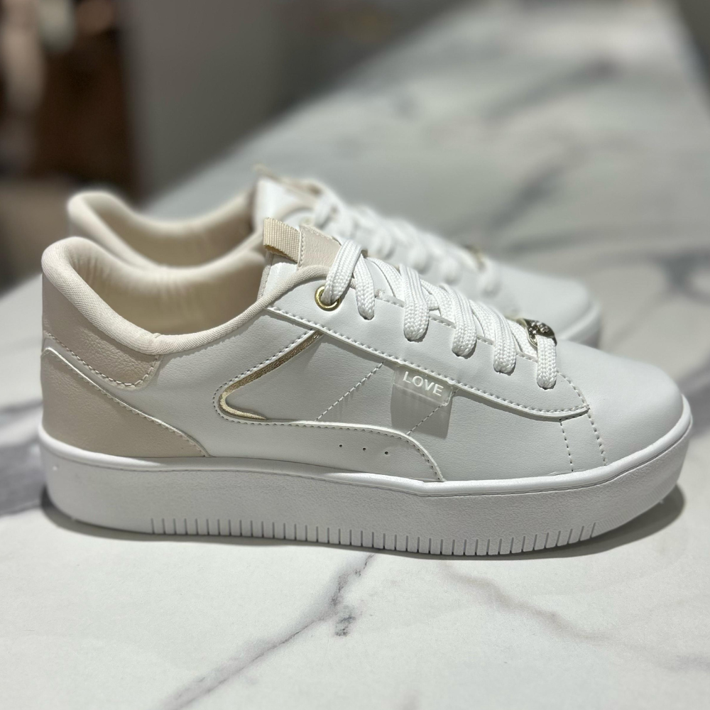 Tênis branco com detalhe nude. Solado 3 cm, bem macio. Disponível na cor branco com nude.