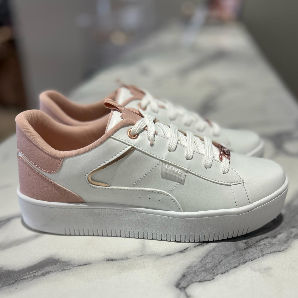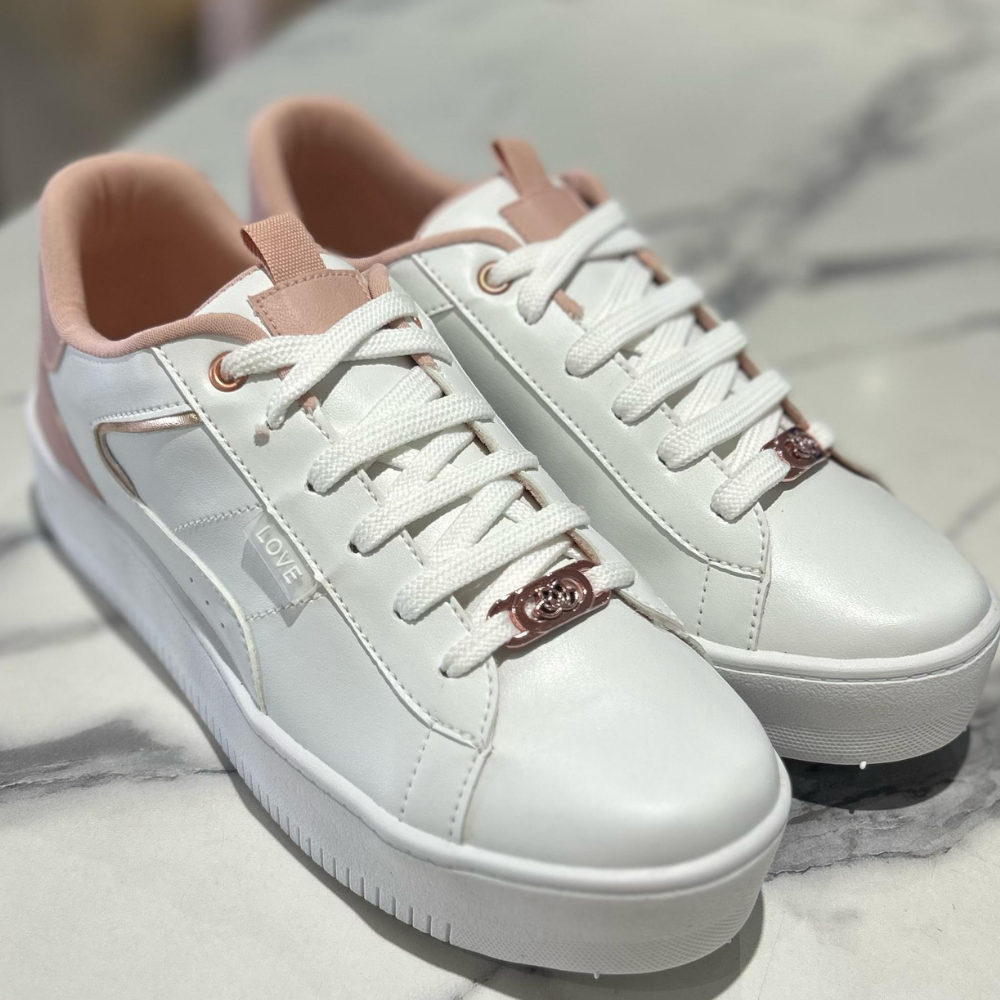 Tênis branco com detalhe rose. Solado 3 cm, bem macio. Disponível na cor branco com rose.